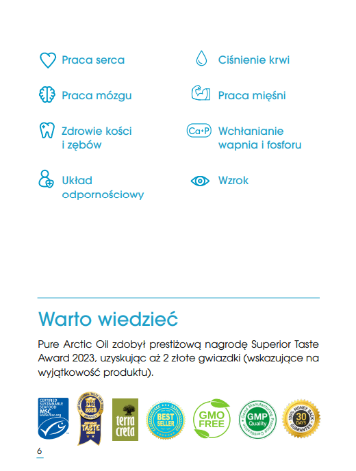Pure Arctic Oil zawiera czyste kwasy omega-3 pochodzące z oleju z dorsza, złowionego w bogatych, arktycznych wodach norweskiego wybrzeża. Warto pamiętać, że kwasy omega-3 są składnikiem wysoce niedoborowym we współczesnej diecie, dlatego ich suplementacja może być kontynuowana stale i nie ma konieczności robienia przerw, zarówno u dzieci jak i osób dorosłych.